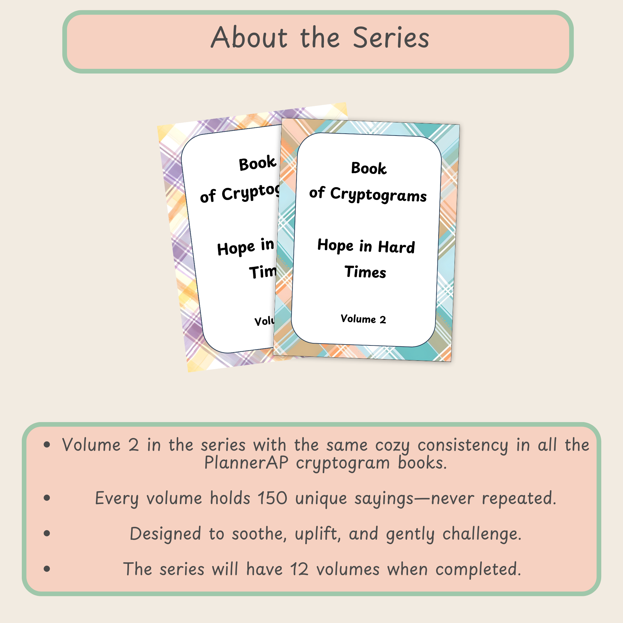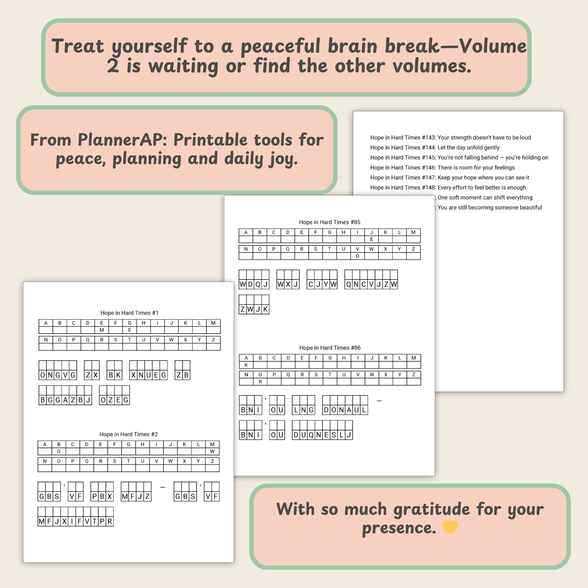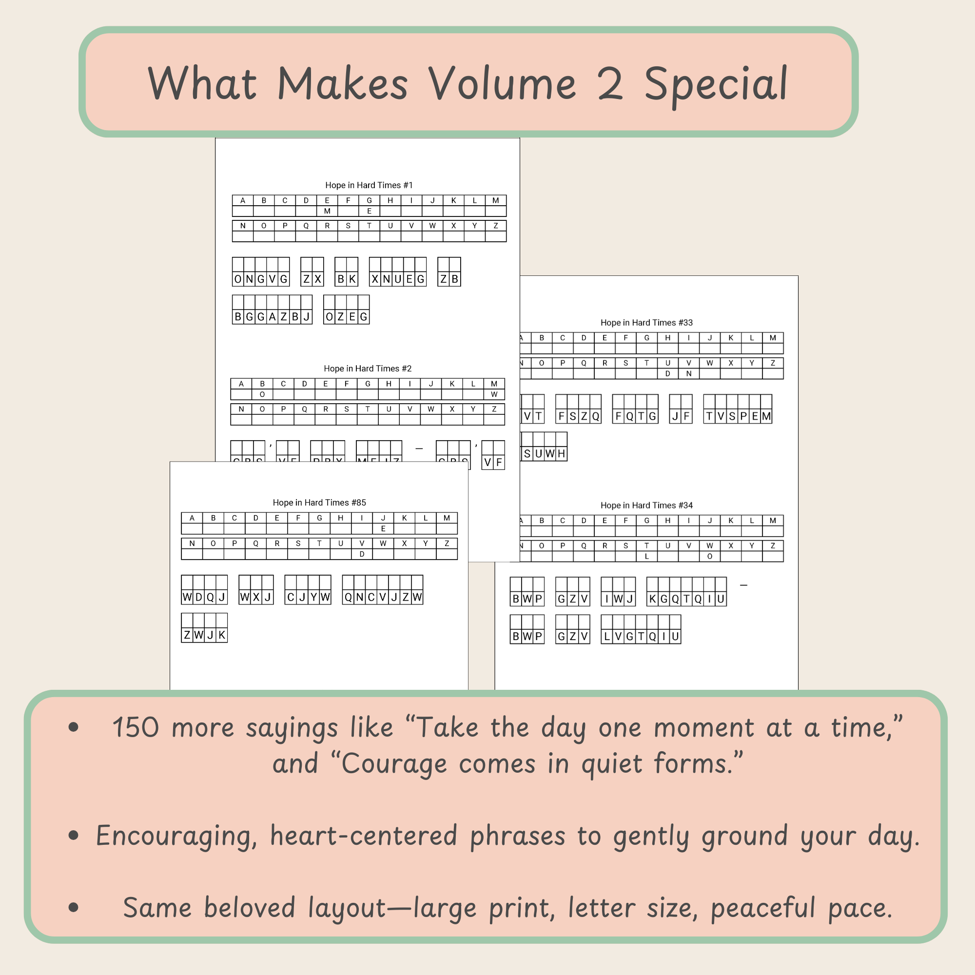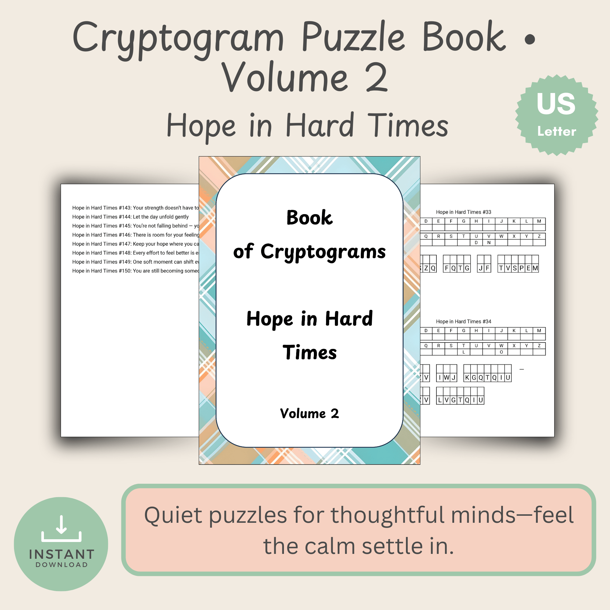 Step into a peaceful moment with Hope in Hard Times Cryptogram Book Volume 2. This puzzle collection is designed to help you slow down, reflect, and gently engage your mind.
