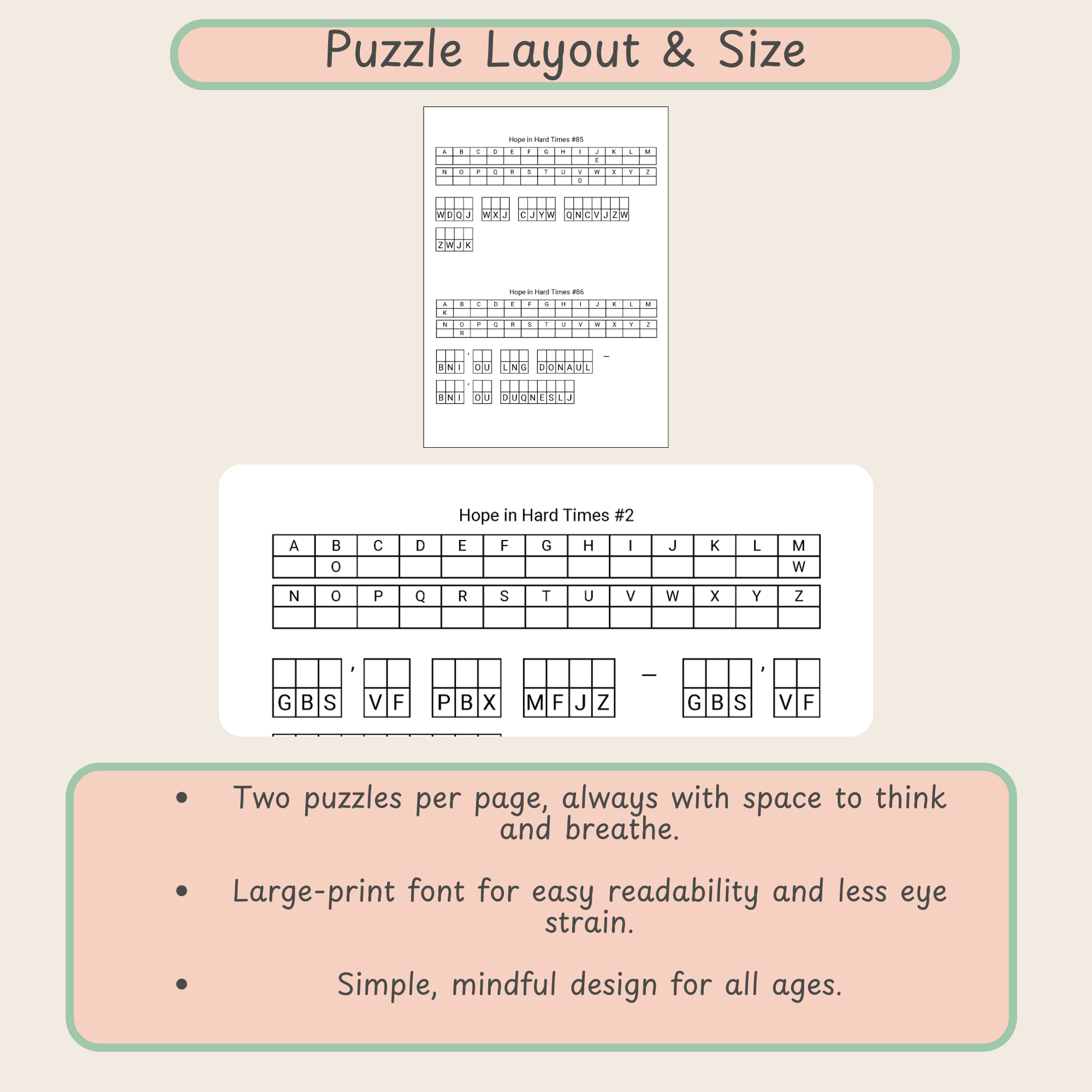A calming set of 150 large print cryptograms with hints, designed for peaceful focus and encouragement.