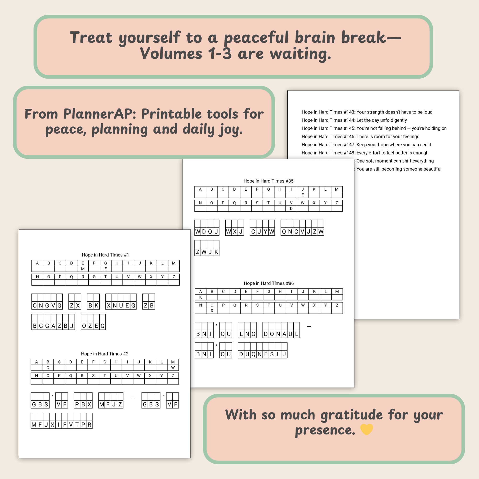 The hidden messages within each cryptogram focus on encouragement, strength, and hope — making this more than just a puzzle book. It becomes a small daily practice of clarity, care, and mindful presence.