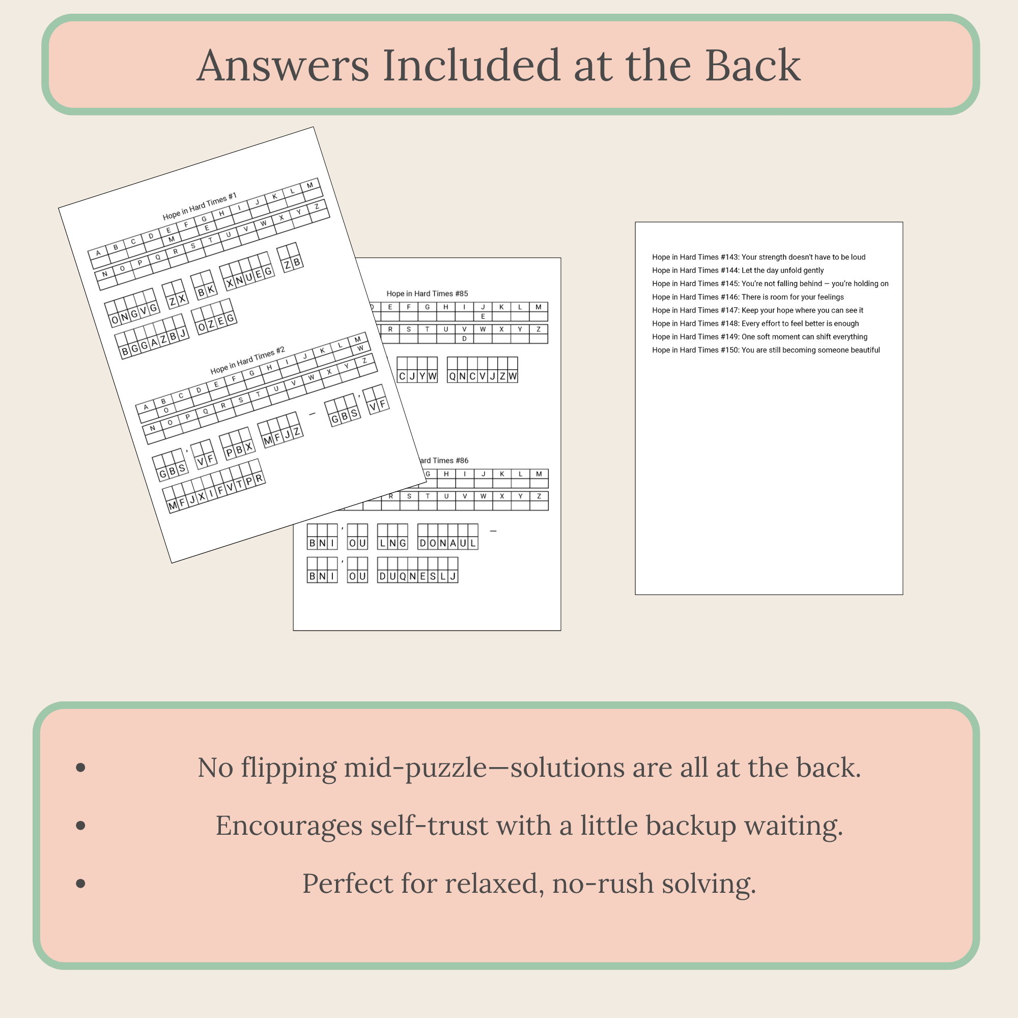 Each puzzle comes with three helpful hints to guide you forward. You can move at your own pace, whether you are new to cryptograms or just want a relaxed experience. You’ll also find a full answer key for easy checking.