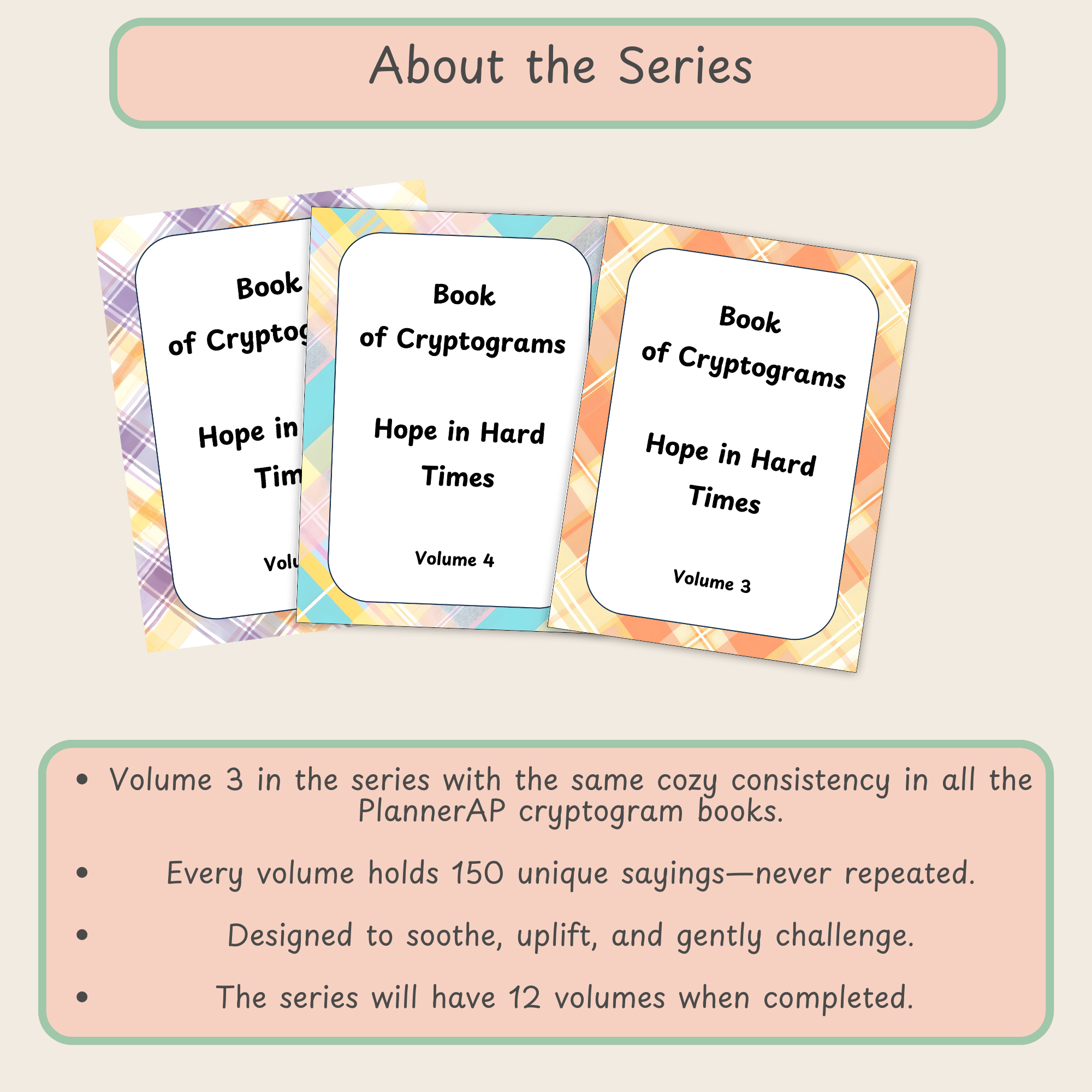 Take a gentle break with Hope in Hard Times Cryptogram Book Volume 4. This soothing collection includes 150 large print puzzles to bring focus and peace to your day.